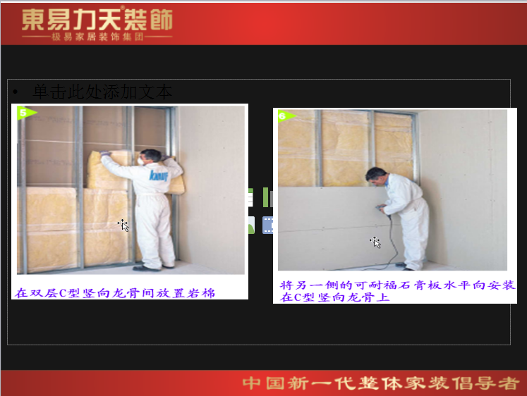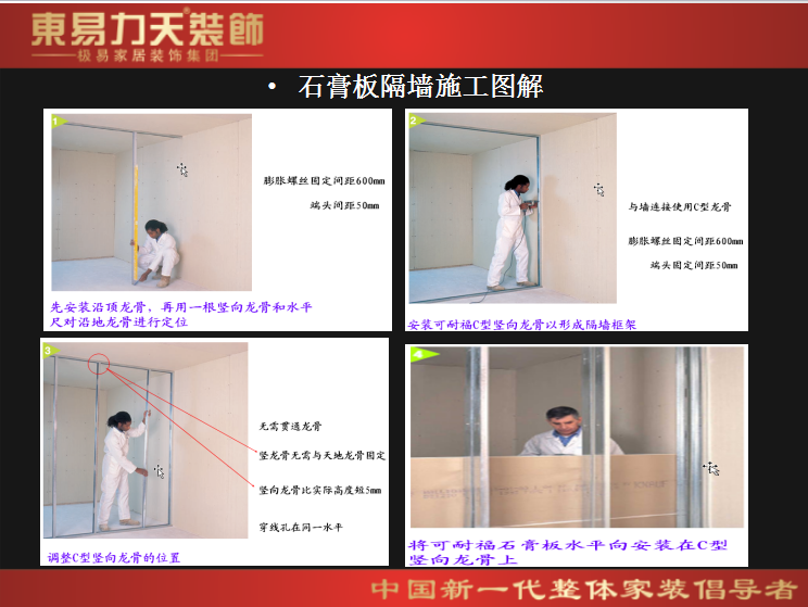 東易力天裝飾 標(biāo)準(zhǔn)吊頂工藝 1.石膏板與龍骨應(yīng)用螺釘固定,釘與板邊距離:紙包邊宜為10~15mm,切割邊宜為15~20mm;板周邊釘距宜為150~170mm,板中釘距不得大于200mm; 2.龍骨與龍骨連接應(yīng)